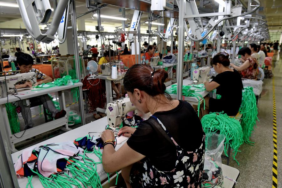 Workers sew swimsuits at a factory of the Qicaihu Garments & Weaving Co., Ltd. in Jinjiang, southeast China's Fujian Province, Aug. 14, 2019. (Xinhua/Zhang Guojun)