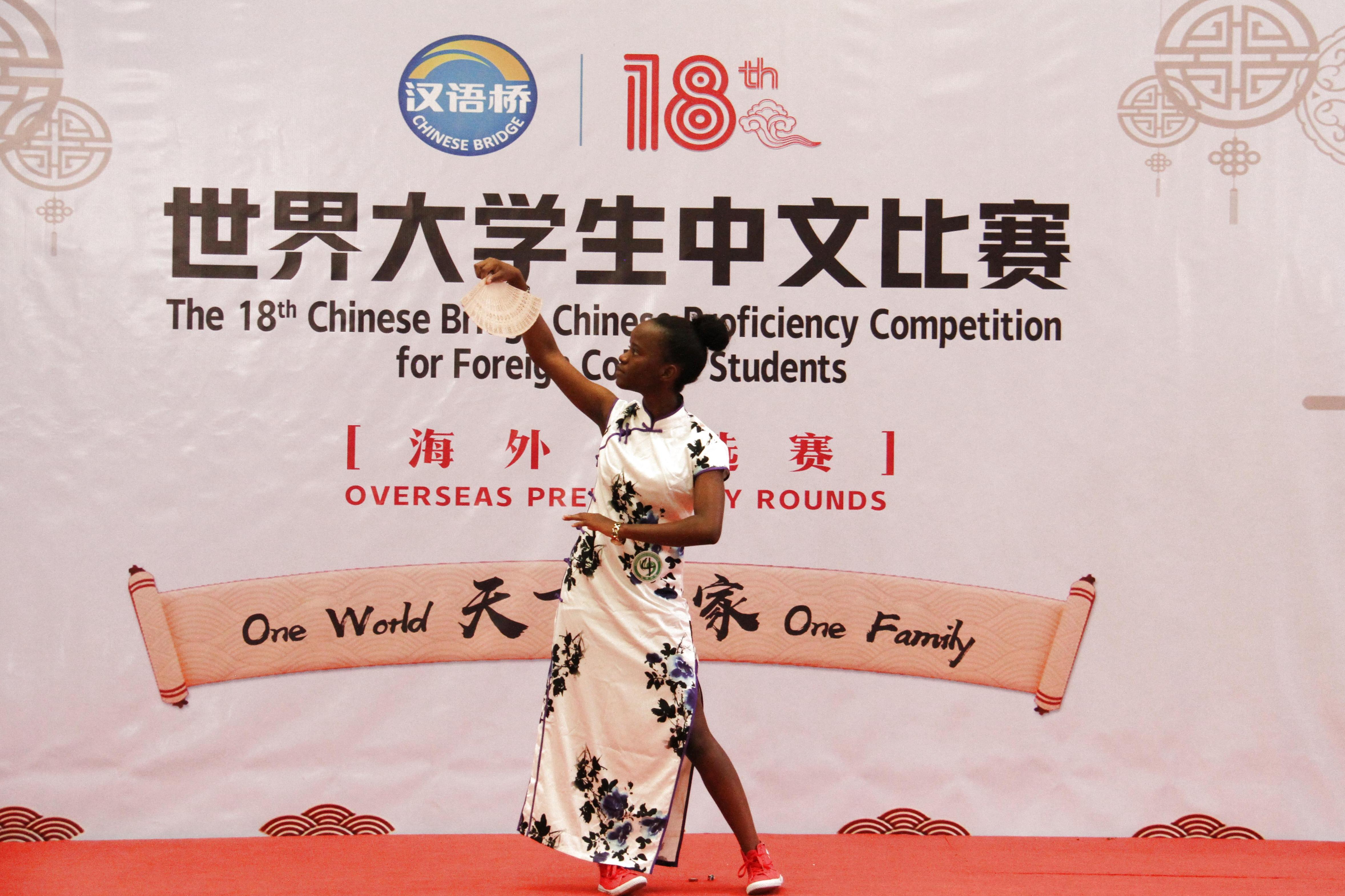 A student takes part in the 18th Kenyan "Chinese Bridge", Chinese proficiency competition for foreign university students, in Nairobi, Kenya, on May 24, 2019. (Xinhua/Wang Teng)