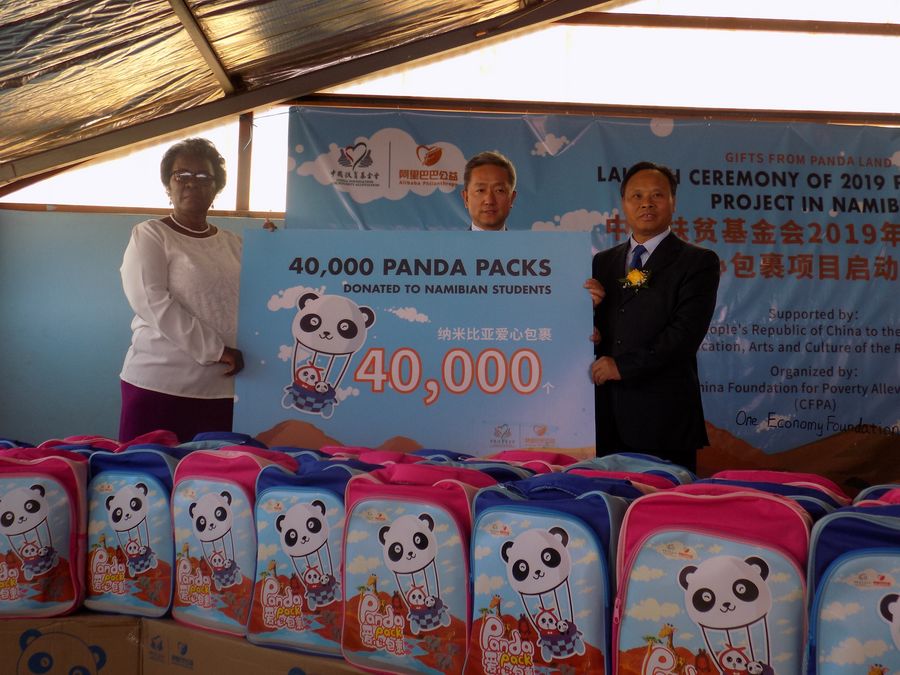 The China Foundation for Poverty Alleviation donates 40, 000 Panda Packs with stationery in Namibia. The donation helps the students who used to carry learning materials in plastic bags, conveys the Chinese people's kindness and will deepen the friendship between the two nations.