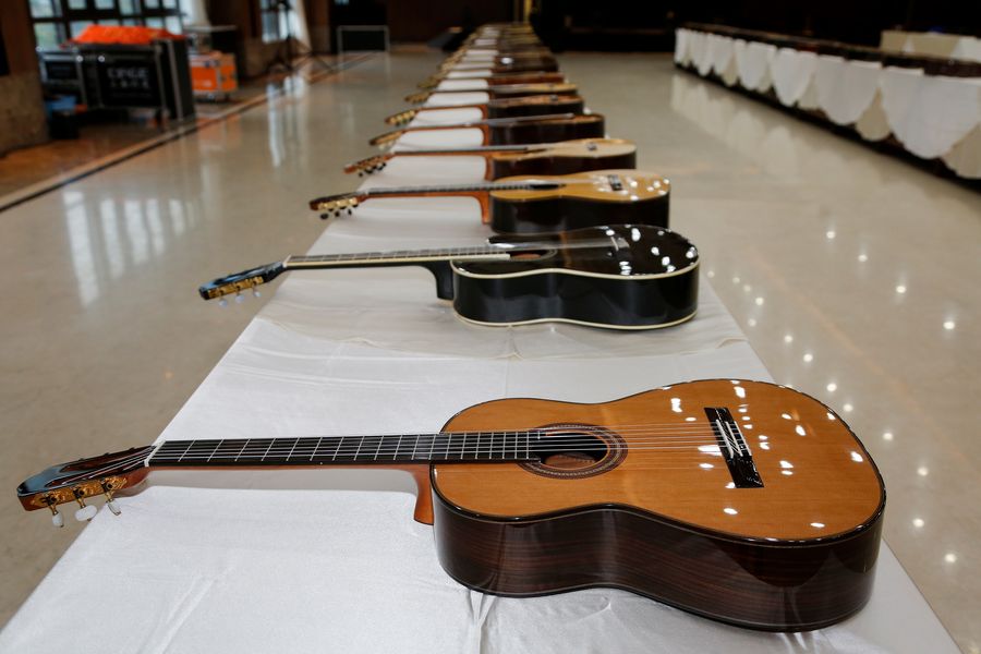 Candidate guitars at a national guitar making competition in Zheng'an County in Zunyi City, southwest China's Guizhou Province on Oct. 27, 2019. (Photo provided to Xinhua)