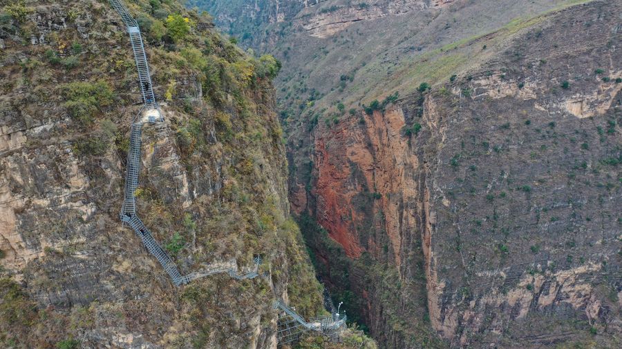 Aerial photo taken on Nov. 23, 2019 shows a steel ladder built along the cliff in Atulie'er Village, Zhaojue County. (Xinhua/Wang Xi)