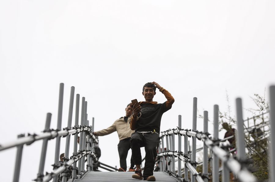 People of Yi ethnic group climb a steel ladder built along the cliff in Atulie'er Village, Zhaojue County, Liangshan Yi Autonomous Prefecture, southwest China's Sichuan Province, Nov. 24, 2019. (Xinhua/Jiang Hongjing)