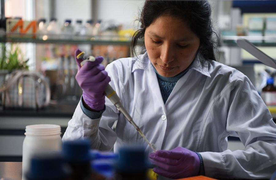 Marinoli Rivas, professor of biological sciences at the National University of San Marcos, does research in a laboratory at the South China Botanical Garden in Guangzhou, south China's Guangdong Province, Dec. 3, 2019. (Xinhua/Deng Hua)