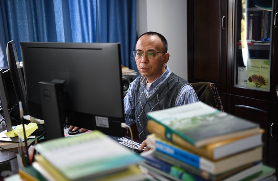 Ge Xuejun, a professor with the joint lab co-founded by the South China Botanical Garden and the Peruvian National University of San Marcos, works in his office at the South China Botanical Garden in Guangzhou, south China's Guangdong Province, Dec. 3, 2019. (Xinhua/Deng Hua)