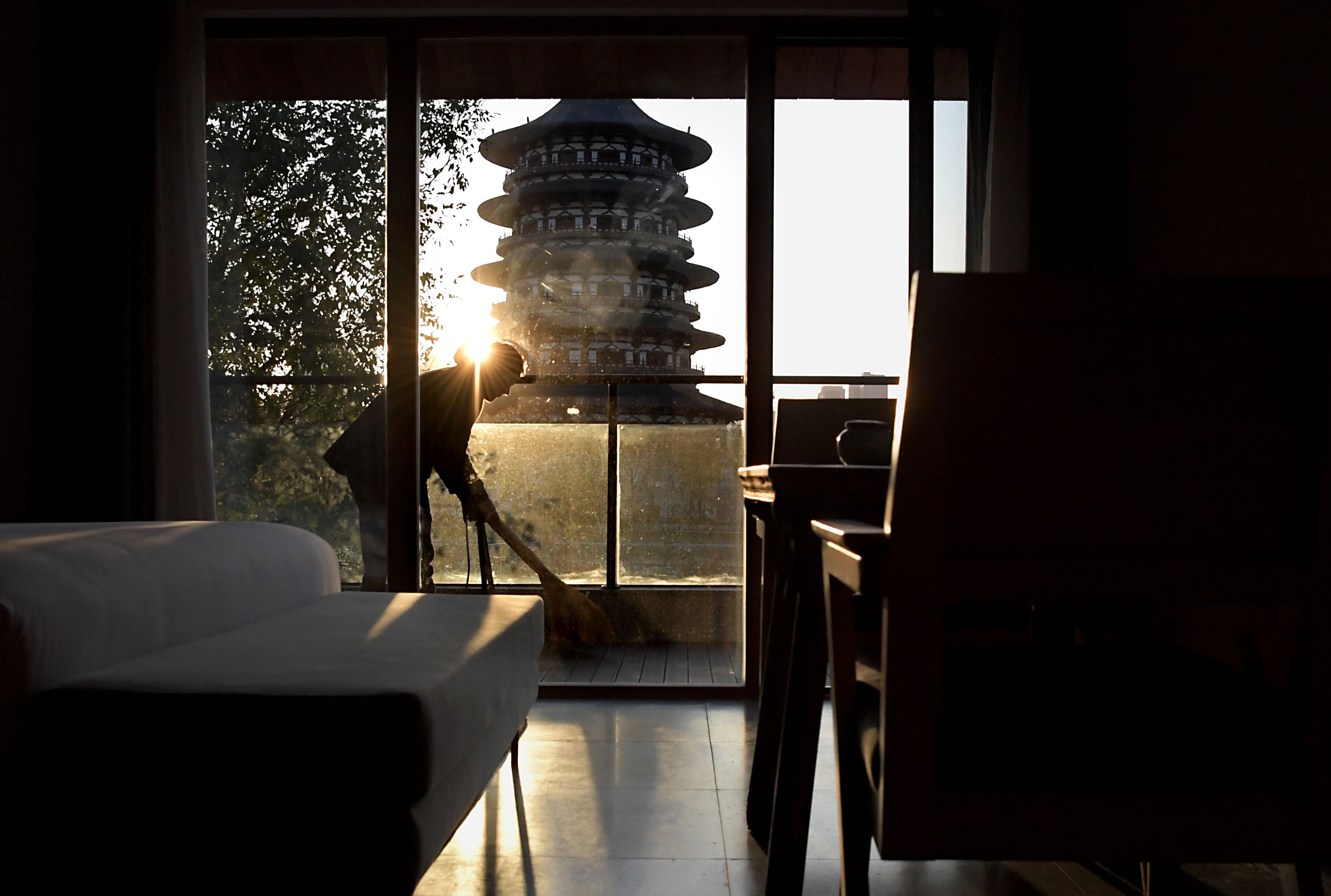 A staff member cleans a homestay reconstructed on the site of an old warehouse at the Tianxin cultural and arts industry park in Luoyang, central China's Henan Province, Dec. 3, 2019. Luoyang has transformed the idled plants of a old factory into cultural and creative industry park in recent years. The park has attracted over 60 companies including publishing, performing, arts training, catering and hotel and became a famous tourist destination on internet. (Xinhua/Li An)