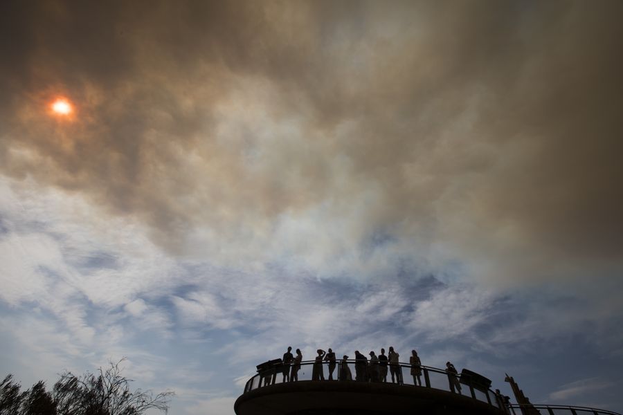 Citizens observe the condition of the bushfire in the smoke-shrouded Blue Mountain area, New South Wales, Australia, Dec. 21, 2019. (Xinhua/Bai Xuefei)