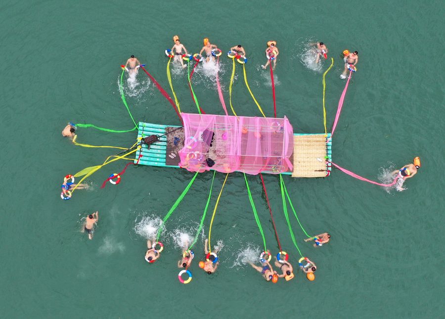 Aerial photo taken on Jan. 4, 2020 shows winter swimming fans attending a game in the Xiangjiang River in Hengnan County, central China's Hunan Province. (Photo by Cao Zhengping/Xinhua)