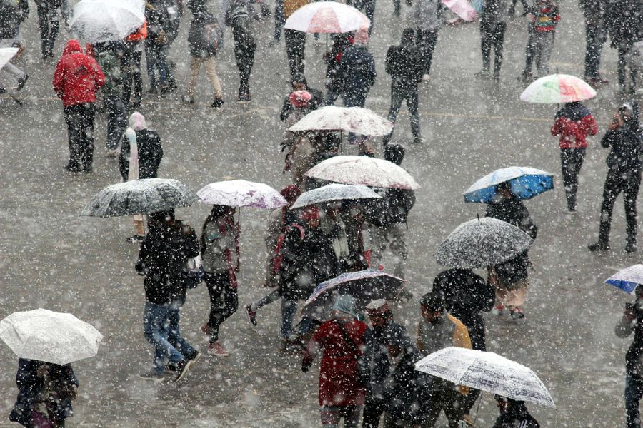 People walk in snow in Shimla, capital of the northern Indian state of Himachal Pradesh, on Jan. 4, 2020. (Str/Xinhua)