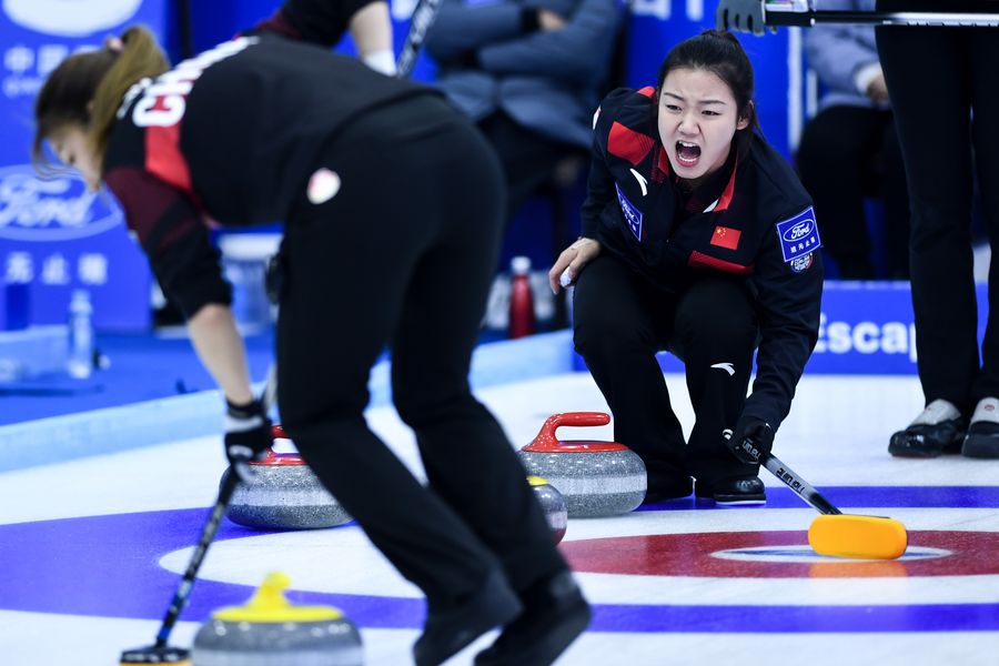 Han Yu (R) of China competes during the women's match at the International Curling Elite 2019 in Xining, capital of northwest China's Qinghai Province, Dec. 10, 2019. (Xinhua/Wu Gang)
