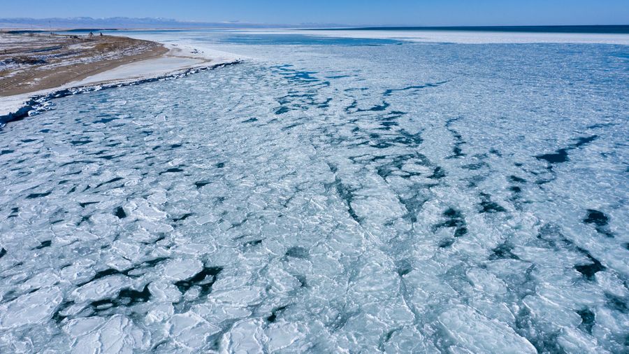 Aerial photo taken on Dec. 27, 2019 shows the frozen Qinghai Lake in northwest China's Qinghai Province. (Xinhua/Wu Gang)
