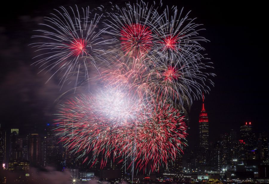Fireworks explode above the Hudson River in New York, the United States, on Jan. 23, 2020, to celebrate the upcoming Chinese Lunar New Year. (Xinhua/Wang Ying)