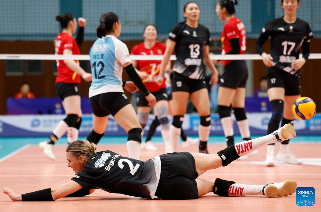 Beijing's Edina Begic (front) fails to save the ball during the 5th round match between Beijing and Jiangsu at China Women's Volleyball League 2025-2026 in Beijing, China, Dec. 27, 2025. (Xinhua/Wang Lili)