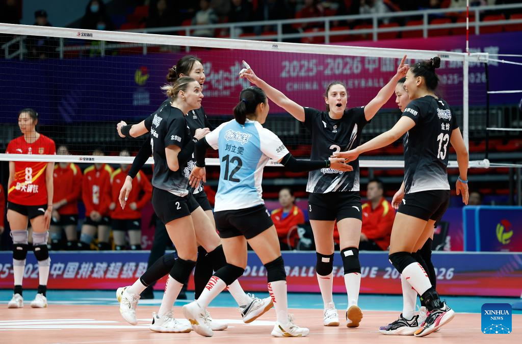 Beijing's Jelena Vulin (3rd R) celebrates scoring with teammates during the 5th round match between Beijing and Jiangsu at China Women's Volleyball League 2025-2026 in Beijing, China, Dec. 27, 2025. (Xinhua/Wang Lili)
