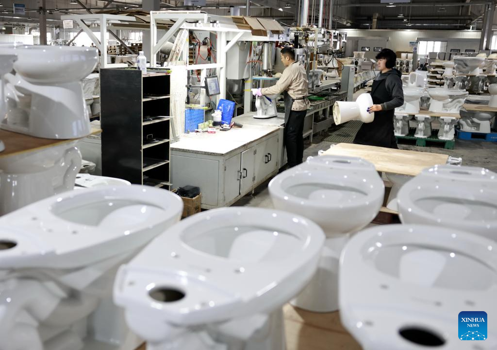 Workers work at a bathroom product manufacturer in Tangshan Port economic development zone in Tangshan, north China's Hebei Province, Dec. 26, 2025. Leveraging its geographical advantages, the economic development zone has developed industries such as high-quality steel, equipment manufacturing, fine chemicals, high-end bathroom product and new energy to boost high-quality economic growth. (Xinhua/Yang Shiyao)