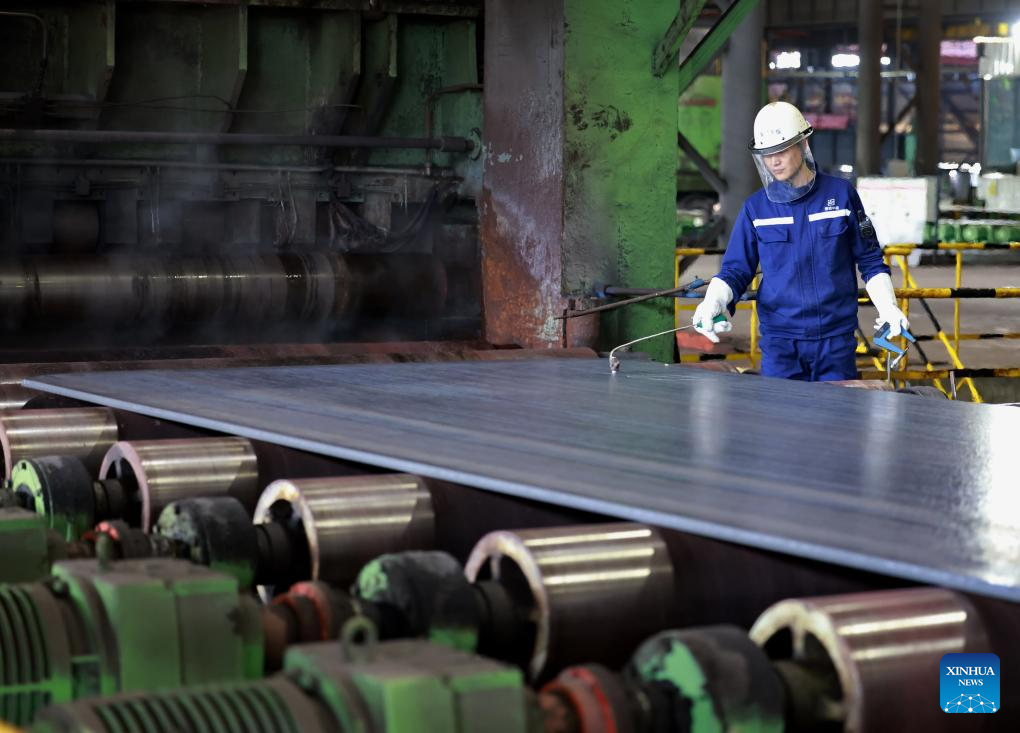 A man works on the production line of a shipbuilding steel enterprise in Tangshan Port economic development zone in Tangshan, north China's Hebei Province, Dec. 26, 2025. Leveraging its geographical advantages, the economic development zone has developed industries such as high-quality steel, equipment manufacturing, fine chemicals, high-end bathroom product and new energy to boost high-quality economic growth. (Xinhua/Yang Shiyao)