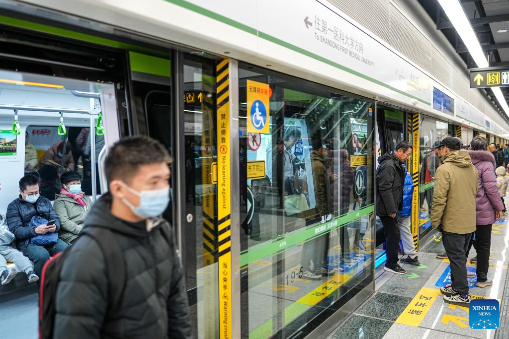 Citizens take the train of Jinan Subway Line 4, in Jinan, east China's Shandong Province, Dec. 27, 2025. China's first subway line passing through a karst spring area began operation on Saturday in Jinan, marking an engineering breakthrough that balances urban transit demands with the protection of natural water resources.