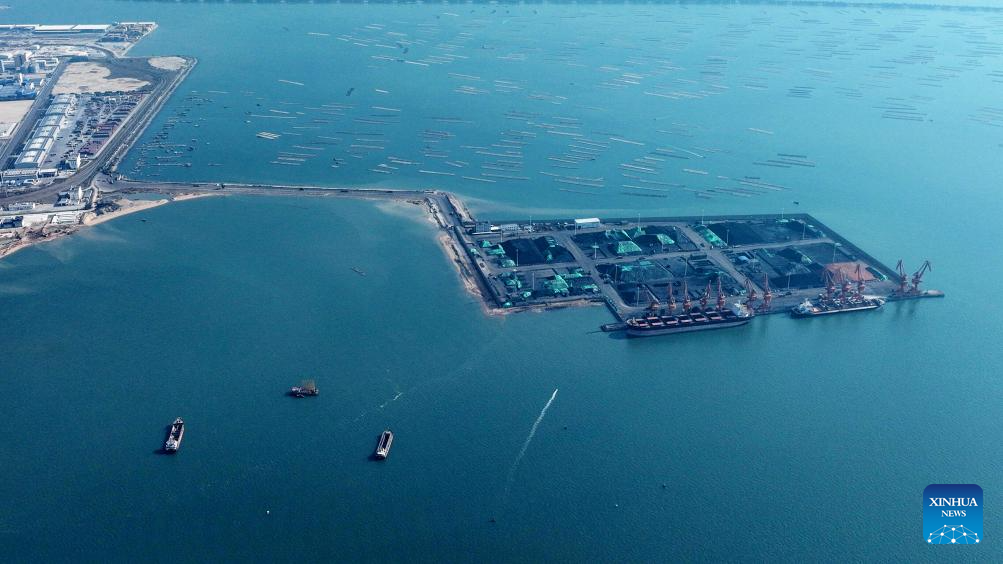An aerial drone photo taken on Dec. 27, 2025 shows a bulk cargo terminal of the Qinzhou Port in the Maowei Sea in Qinzhou, south China's Guangxi Zhuang Autonomous Region. In winter, the Maowei Sea in Guangxi presents picturesque scenery. In recent years, Guangxi has implemented high-standard ecological protection of the marine environment in the Beibu Gulf, transforming the Maowei Sea into a new cultural and tourism landmark. (Xinhua/Zhang Ailin)