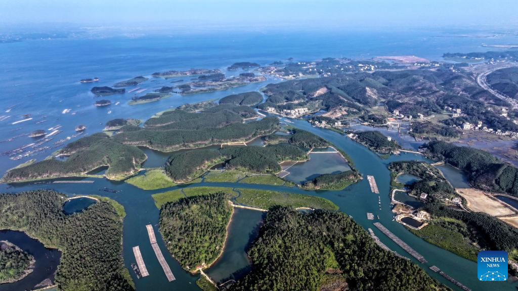 An aerial drone photo taken on Dec. 27, 2025 shows the winter scenery of the Maowei Sea in Qinzhou, south China's Guangxi Zhuang Autonomous Region. In winter, the Maowei Sea in Guangxi presents picturesque scenery. In recent years, Guangxi has implemented high-standard ecological protection of the marine environment in the Beibu Gulf, transforming the Maowei Sea into a new cultural and tourism landmark. (Xinhua/Zhang Ailin)
