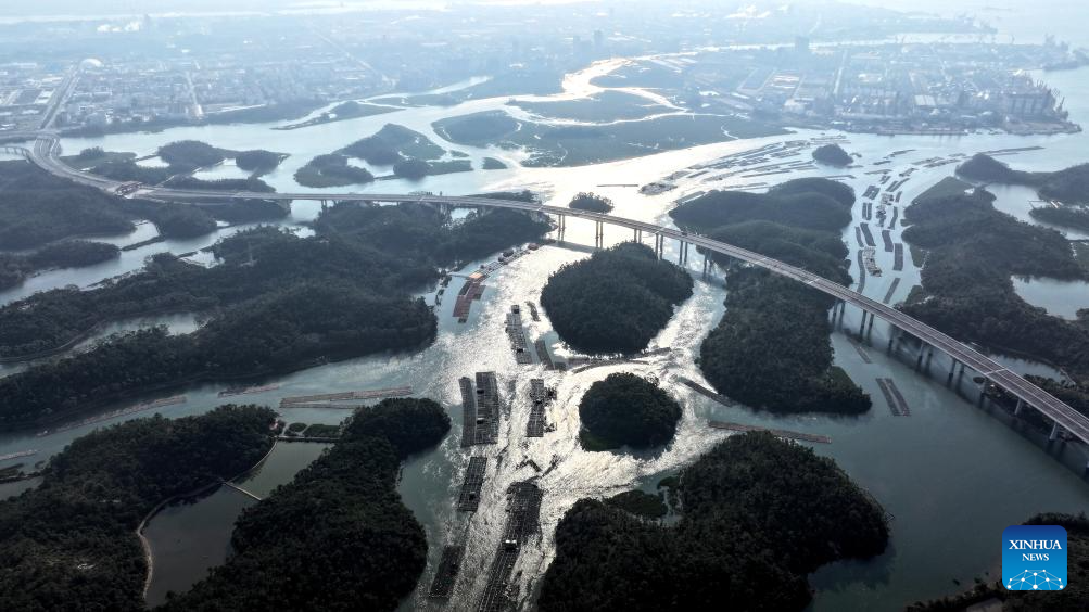 An aerial drone photo taken on Dec. 27, 2025 shows the estuary of the Pinglu Canal in Qinzhou, south China's Guangxi Zhuang Autonomous Region. In winter, the Maowei Sea in Guangxi presents picturesque scenery. In recent years, Guangxi has implemented high-standard ecological protection of the marine environment in the Beibu Gulf, transforming the Maowei Sea into a new cultural and tourism landmark. (Xinhua/Zhang Ailin)