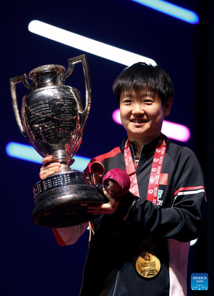 This file photo taken on May 25, 2025 shows gold medslist Sun Yingsha of China posing with the trophy during the awarding ceremony for the women's singles event at ITTF World Table Tennis Championships Finals Doha 2025 in Doha, Qatar. (Xinhua/Liu Xu)