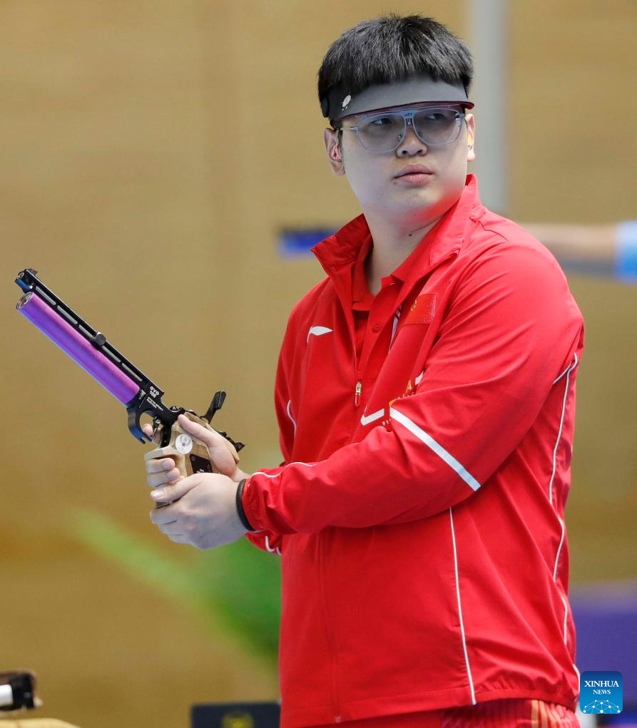 This file photo taken on Nov. 10, 2025 shows Hu Kai of China reacting during the 10m air pistol men's final of shooting at the 2025 ISSF World Championship Rifle/Pistol in Cairo, Egypt. (Xinhua/Ahmed Gomaa)