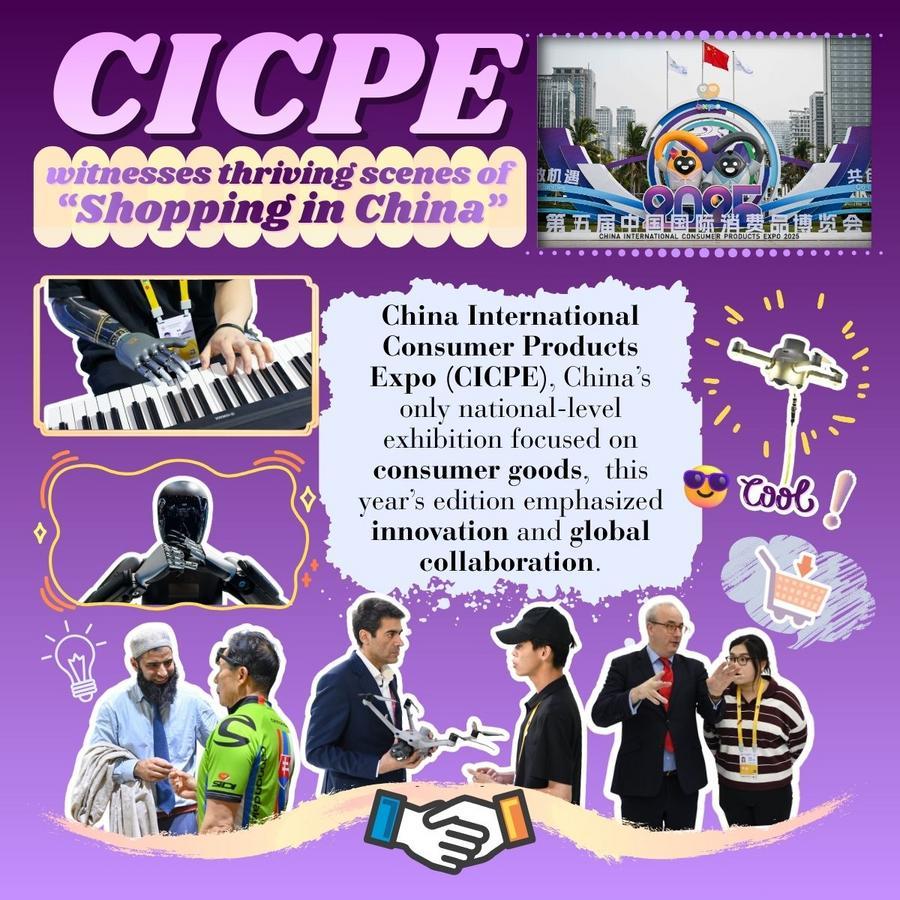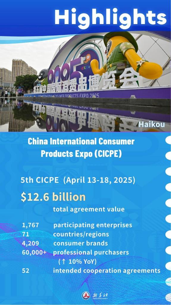 People visit the 5th China International Consumer Products Expo (CICPE) in Haikou, south China's Hainan Province, April 17, 2025. (Xinhua/Zhang Liyun)Visitors try specialties of Harbin at the 5th China International Consumer Products Expo (CICPE) in Haikou, south China's Hainan Province, April 16, 2025. (Xinhua/Zhang Liyun)An exhibitor from Uzbekistan introduces products to a visitor at the 5th China International Consumer Products Expo (CICPE) in Haikou, south China's Hainan Province, April 17, 2025. (Xinhua/Guo Cheng)Visitors select Malaysian products at the 5th China International Consumer Products Expo (CICPE) in Haikou, south China's Hainan Province, April 15, 2025. (Xinhua/Yang Guanyu)A staff member introduces a product to a visitor at the booth of DJI at the 5th China International Consumer Products Expo (CICPE) in Haikou, south China's Hainan Province, April 15, 2025. (Xinhua/Sun Xiaotian)An exhibitor plays piano with a smart prosthetic hand at the 5th China International Consumer Products Expo (CICPE) in Haikou, south China's Hainan Province, April 13, 2025. (Xinhua/Yang Guanyu)