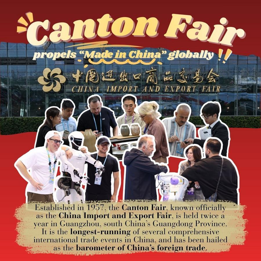 A man poses for a photo outside the venue of the 137th edition of the China Import and Export Fair in Guangzhou, south China's Guangdong Province, April 15, 2025. (Xinhua/Deng Hua)This photo taken on Oct. 15, 2025 shows a scene during the 138th edition of the China Import and Export Fair in Guangzhou, south China's Guangdong Province. (Xinhua/Deng Hua)Purchasers talk with an exhibitor at a garment booth at the 137th China Import and Export Fair in Guangzhou, south China's Guangdong Province, May 5, 2025. (Xinhua/Huang Guobao)Purchasers attend the 137th China Import and Export Fair in Guangzhou, south China's Guangdong Province, May 5, 2025. (Xinhua/Huang Guobao)Foreign buyers pose for a group photo with a humanoid robot at the service-robot zone during the 138th Canton Fair in Guangzhou, south China's Guangdong Province, Oct. 15, 2025. (Xinhua/Lu Hanxin)A foreign purchaser tries an exoskeleton robot for mountain climbing at the booth of Hangzhou Technik Technology Co., Ltd. at the Service Robots Zone during the 138th edition of the China Import and Export Fair (Canton Fair) in Guangzhou, south China's Guangdong Province, Oct. 15, 2025. (Xinhua/Xiao Ennan)