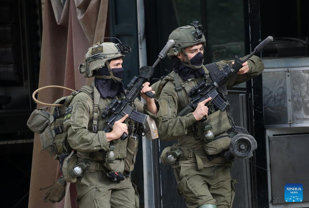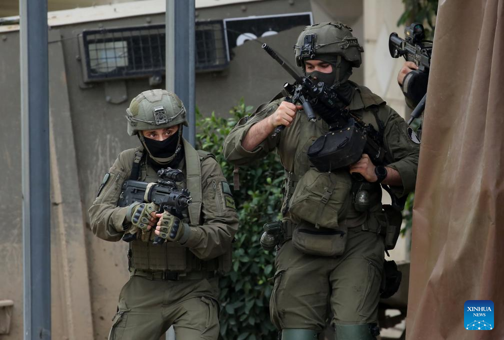 Israeli soldiers are pictured during a military operation on a street in the town of Qabatiya, south of Jenin in the West Bank on Dec. 27, 2025.In the northern West Bank, Israeli troops maintained a tight siege on the town of Qabatiya for a second day. Qabatiya's Mayor Ahmed Zakarneh said Israeli forces have closed entrances, imposed a curfew, damaged infrastructure and raided homes. (Photo by Nidal Eshtayeh/Xinhua)