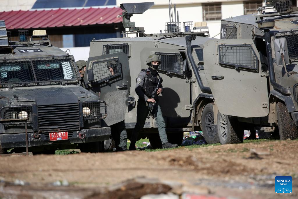 Israeli military vehicles and soldiers are pictured during a military operation in the town of Qabatiya, south of Jenin in the West Bank on Dec. 27, 2025.In the northern West Bank, Israeli troops maintained a tight siege on the town of Qabatiya for a second day. Qabatiya's Mayor Ahmed Zakarneh said Israeli forces have closed entrances, imposed a curfew, damaged infrastructure and raided homes. (Photo by Nidal Eshtayeh/Xinhua)