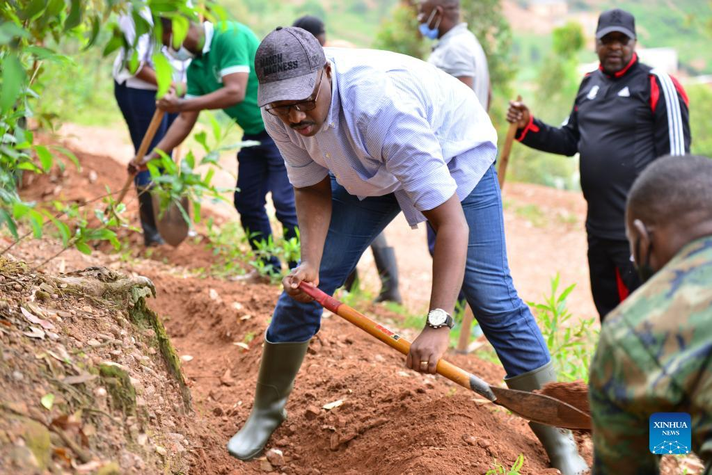 Pudence Rubingisa, mayor of Kigali, takes part in the national community work known as Umuganda in Kigali, Rwanda on March 26, 2022. (Photo by Cyril Ndegeya/Xinhua)