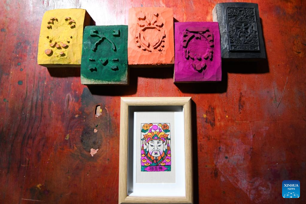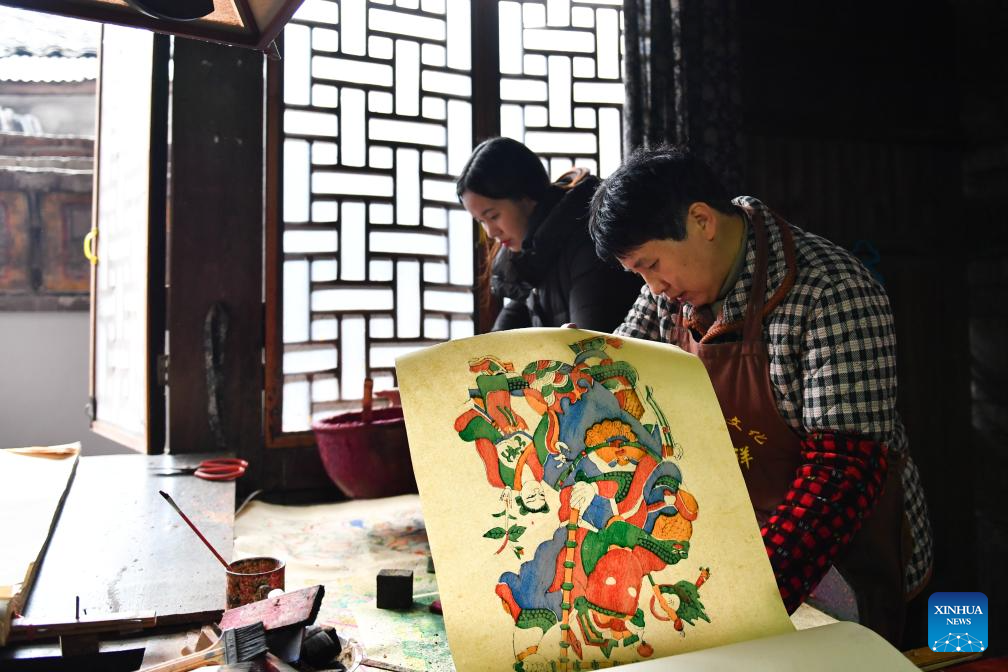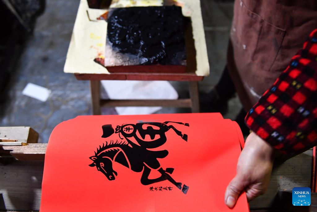 Artist Yin Dongxiang makes copies of nianhua, a type of centuries-old Chinese woodcut New Year picture, at a workshop in Tantou Township of Longhui County, Shaoyang, central China's Hunan Province, Dec. 24, 2025. It is a tradition for Chinese people to paste New Year pictures to celebrate the Spring Festival. The Tantou-style New Year picture, with a history of more than 300 years, was listed as one of China's national intangible cultural heritages in 2006. (Xinhua/Chen Zhenhai)