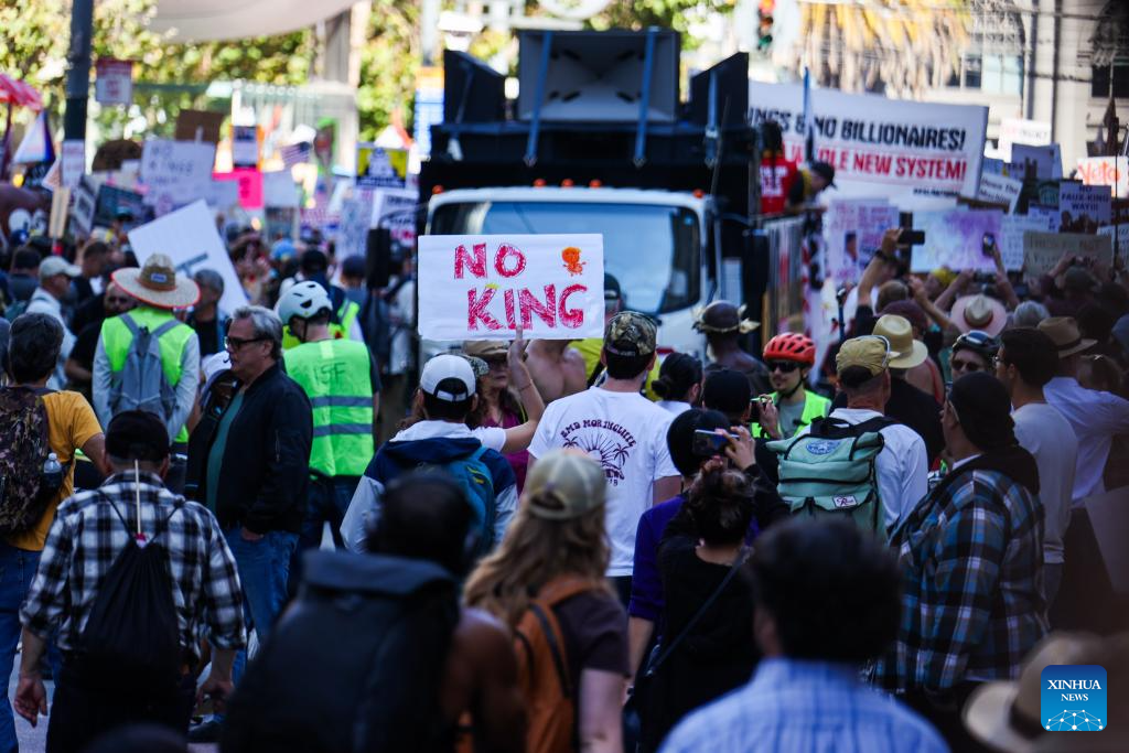 Following the first nationwide "No Kings" protest on June 14, this round of rallies, spanning all 50 states, came as the federal government shutdown entered its 18th day with no resolution in sight. (Xinhua/Li Rui)