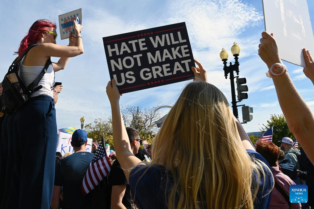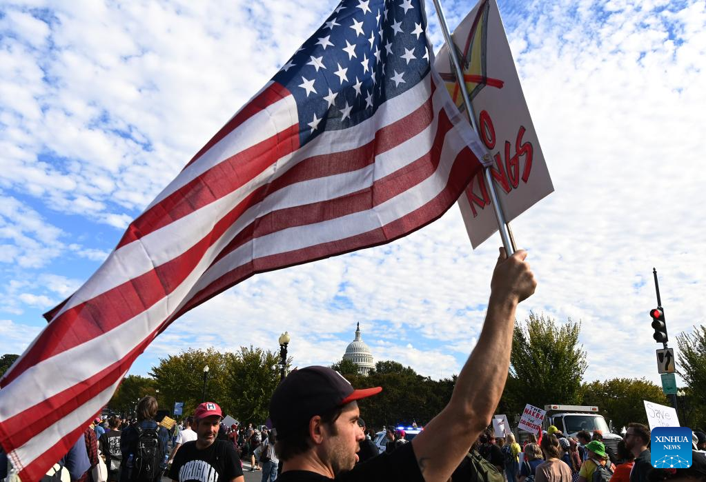 People take part in a "No Kings" protest in Washington, D.C., the United States, on Oct. 18, 2025. Tens of thousands of people took to the streets across 2,700 U.S. cities and towns on Saturday for the second round of the nationwide "No Kings" protests, the largest single-day demonstration in American history.