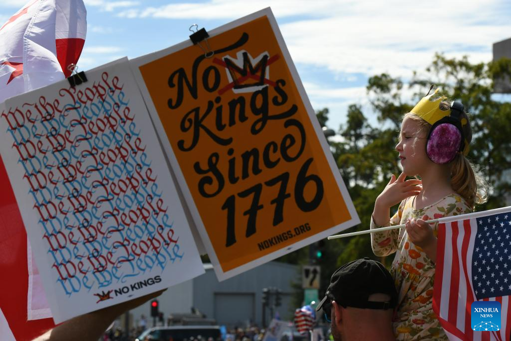 Following the first nationwide "No Kings" protest on June 14, this round of rallies, spanning all 50 states, came as the federal government shutdown entered its 18th day with no resolution in sight. (Xinhua/Zhang Fengguo)