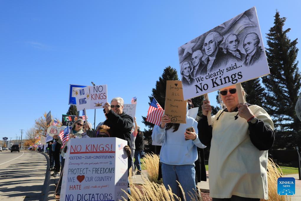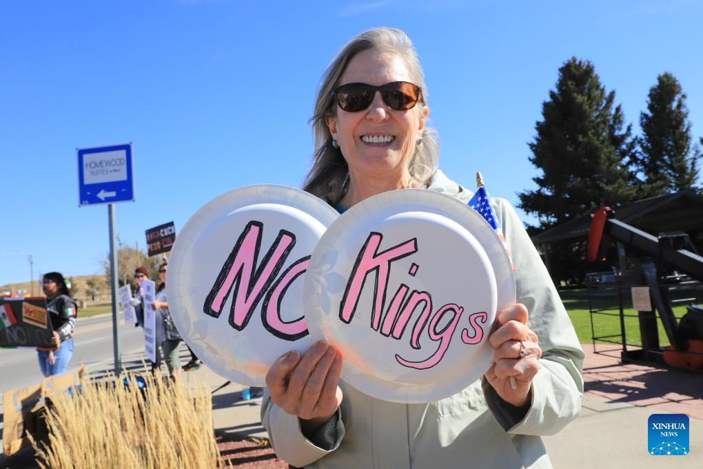 People take part in a "No Kings" protest in Rock Springs, Wyoming, the United States, on Oct. 18, 2025. Tens of thousands of people took to the streets across 2,700 U.S. cities and towns on Saturday for the second round of the nationwide "No Kings" protests, the largest single-day demonstration in American history. Following the first nationwide "No Kings" protest on June 14, this round of rallies, spanning all 50 states, came as the federal government shutdown entered its 18th day with no resolution in sight. (Photo by Ziyu Julian Zhu/Xinhua)