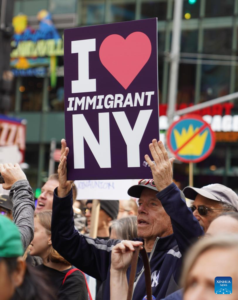 NEW YORK/SAN FRANCISCO, Oct. 18 (Xinhua) -- Tens of thousands of people took to the streets across 2,700 U.S. cities and towns on Saturday for the second round of the nationwide "No Kings" protests, the largest single-day demonstration in American history.