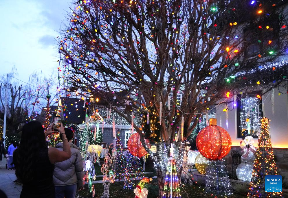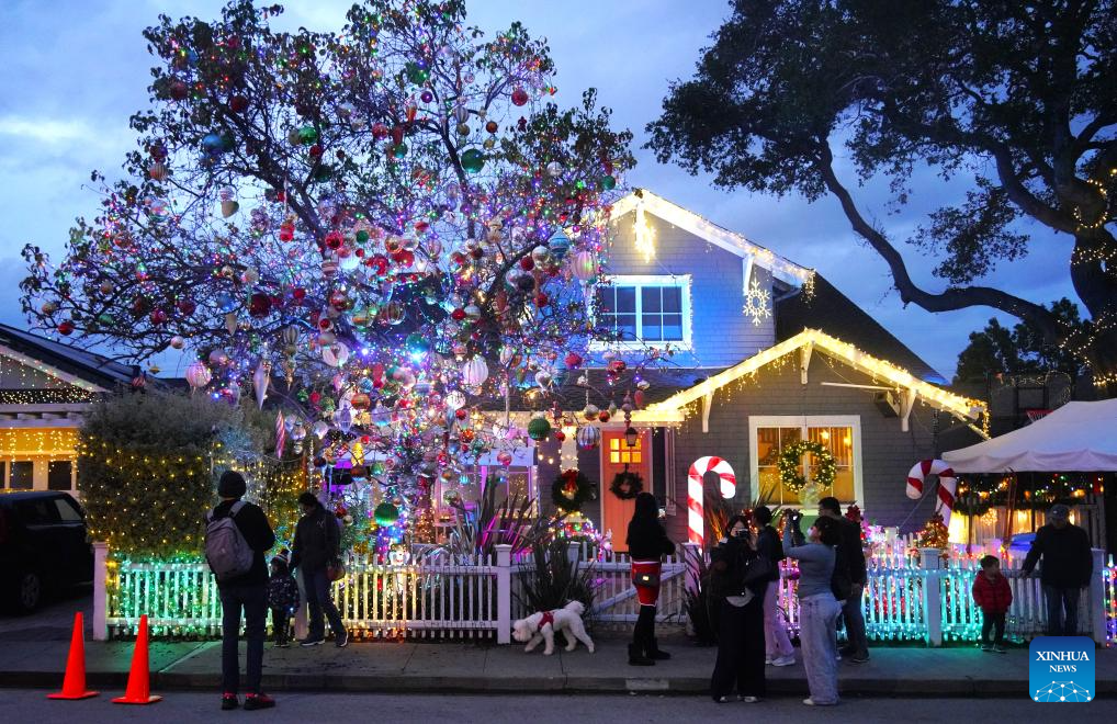 People look at Christmas decorations on the Eucalyptus Avenue of San Carlos in San Francisco Bay Area of California, the United States, Dec. 24, 2025. (Xinhua/Wu Xiaoling)