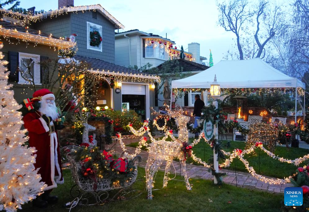 A resident arranges Christmas decorations at home yard on the Eucalyptus Avenue of San Carlos in San Francisco Bay Area of California, the United States, Dec. 24, 2025. (Xinhua/Wu Xiaoling)