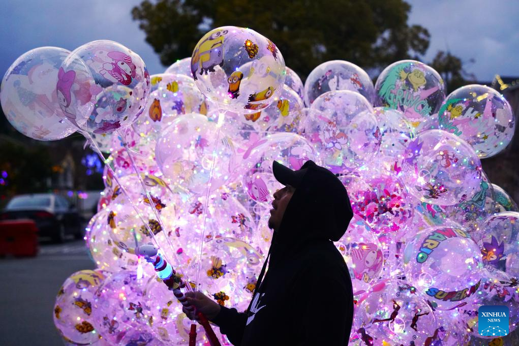 A man sells balloons on the Eucalyptus Avenue of San Carlos in San Francisco Bay Area of California, the United States, Dec. 24, 2025. (Xinhua/Wu Xiaoling)