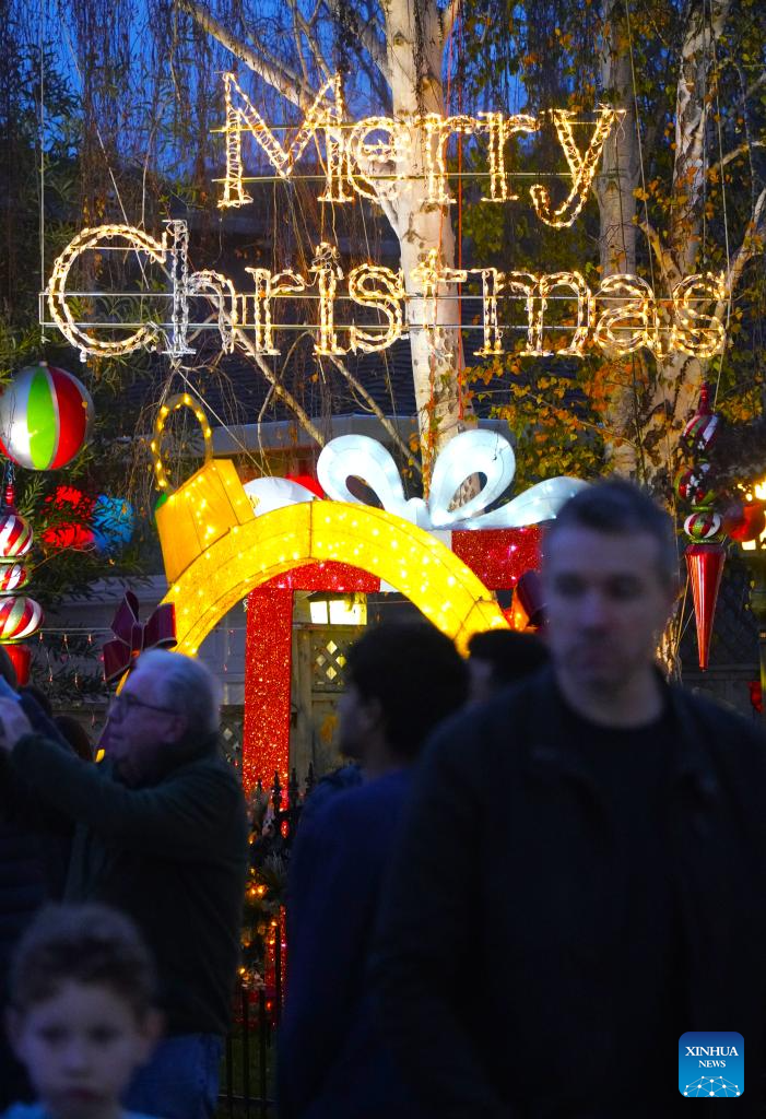 People walk past Christmas decorations on the Eucalyptus Avenue of San Carlos in San Francisco Bay Area of California, the United States, Dec. 24, 2025. (Xinhua/Wu Xiaoling)