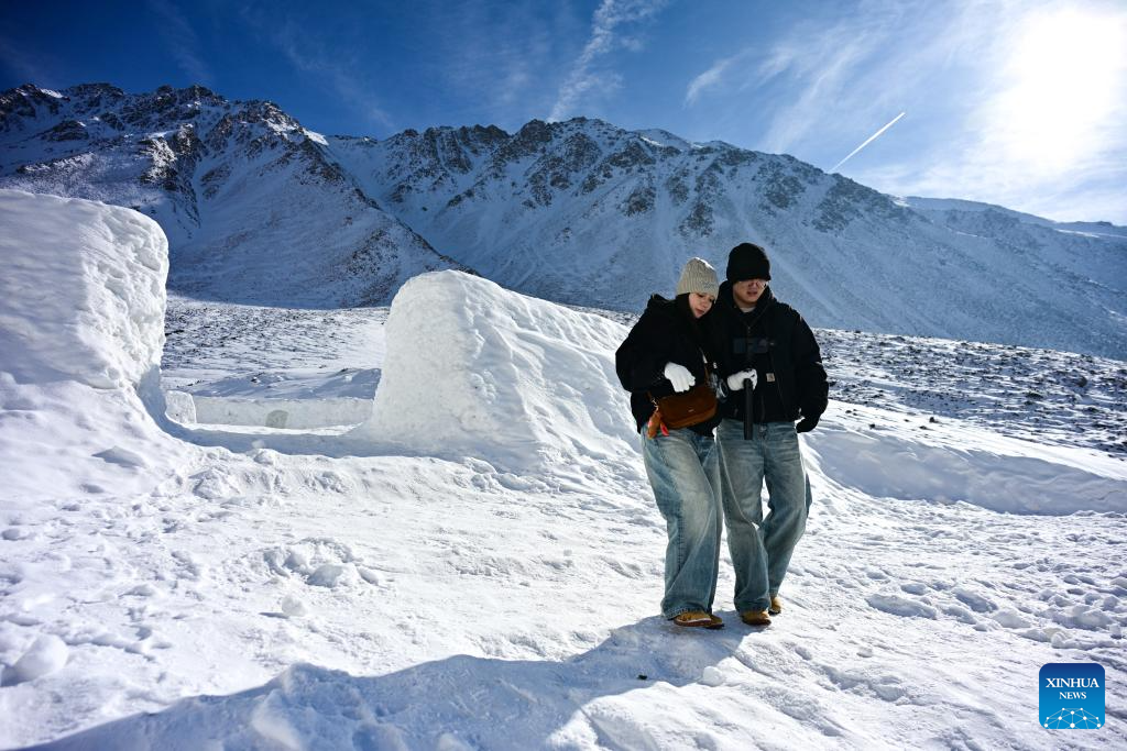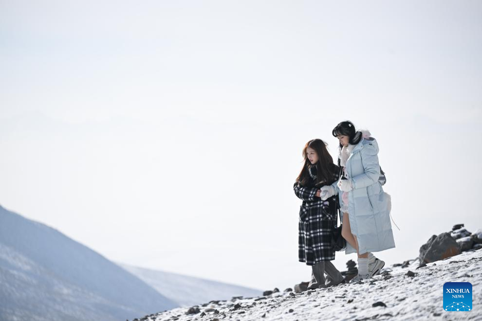 Tourists enjoy the scenery at Mt. Gangshika scenic area in Menyuan Hui Autonomous County, northwest China's Qinghai Province, Dec. 25, 2025. The snow-covered Mt. Gangshika, the highest peak in the eastern section of the Qilian Mountains, attracts lots of tourists in winter with its magnificent scenery. (Xinhua/Zhang Long)