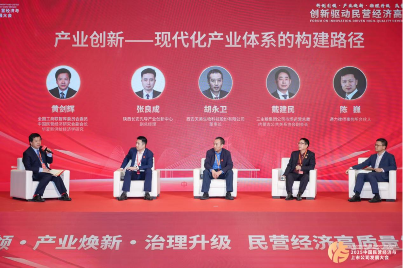 图为“产业创新——现代化产业体系的构建路径”主题对话。该场圆桌对话由全国工商联智库委员会委员、中国民营经济研究会原副会长黄剑辉主持,陕西长安先导产业创新中心副总经理张良成,西安天美生物科技股份有限公司董事长胡永卫,三主粮集团公司市场运营总裁、内蒙古公共关系协会副会长戴建民,通力律师事务所合伙人陈巍现场交流。新华网发