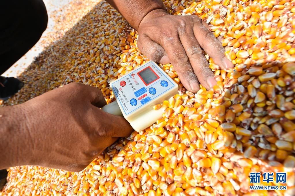 在山西省運(yùn)城市萬榮縣南張鄉(xiāng)太趙村,種糧戶李挺用儀器測量玉米的含水量(2020年9月20日攝)。據(jù)李挺介紹,農(nóng)機(jī)GPS定位、無人機(jī)噴灑農(nóng)藥、機(jī)械化收割等已滲透到農(nóng)業(yè)生產(chǎn)的各個(gè)環(huán)節(jié),臉朝黃土背朝天的農(nóng)民變成了指揮機(jī)器高效種糧的“新農(nóng)夫”。