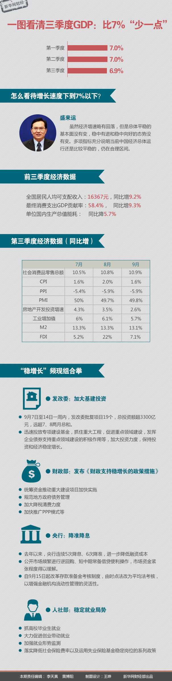 ????新華網(wǎng)北京10月19日電(記者 徐曼曼)備受關(guān)注的中國經(jīng)濟(jì)“三季報(bào)”今日揭開面紗。國家統(tǒng)計(jì)局?jǐn)?shù)據(jù)顯示,三季度GDP同比增幅為6.9%,創(chuàng)下自2009年以來的最低增速,系官方首次以分季方式核算的GDP數(shù)據(jù)。初步核算,前三季度國內(nèi)生產(chǎn)總值487774億元,按可比價(jià)格計(jì)算,同比增長6.9%。