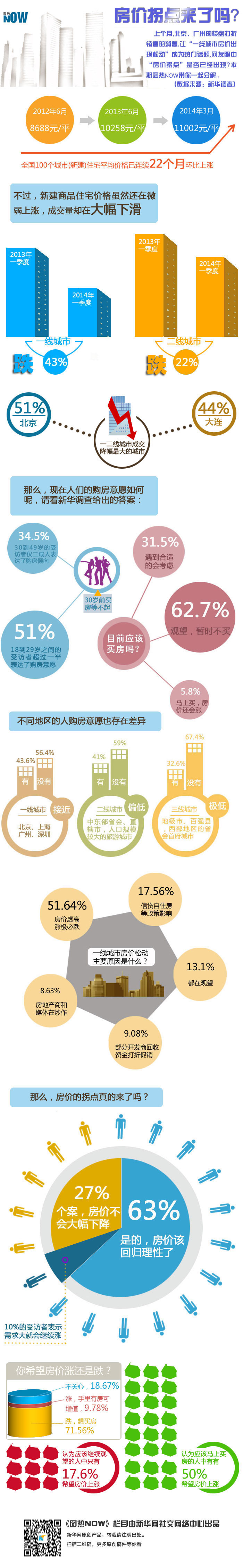 4月1日,中指院發(fā)布2014年3月中國房地產指數系統百城價格指數報告,在房價漲幅趨緩的同時,成交量也大幅下滑,上個月,北京、廣州的樓盤打折銷售的消息,讓“一線城市房價出現松動”成為熱門話題,“新華調查”欄目推出了“一線城市房價是否到了拐點?”的專題調查,那么,網友眼中“房價拐點”是否已經出現?本期圖熱NOW帶你一起分解。