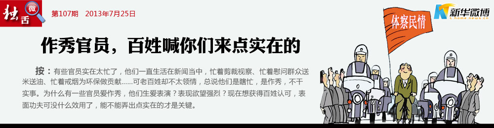 讓群眾開心? 讓領(lǐng)導開心:作假;讓同級開心:作?。蛔屓罕婇_心:作秀。作秀,不會讓群眾開心,卻會嚴重損害執(zhí)政黨的威信,消費黨的信譽。