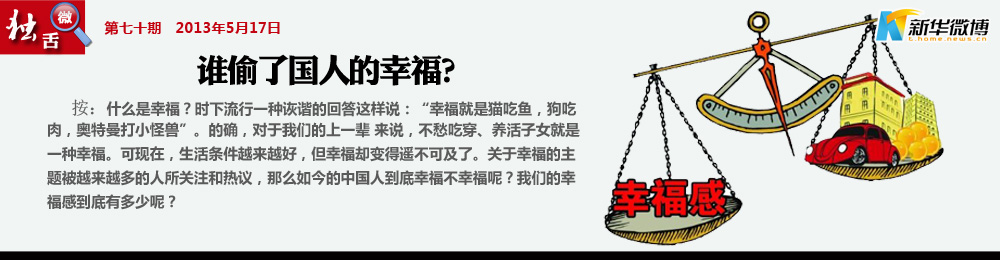 幸福是“比較出來的” 在電影《求求你,表?yè)P(yáng)我》中,記者王志文問:什么是幸福?農(nóng)民工范偉回答:幸福就是我餓了,看見別人拿了個(gè)肉包子,那他就比我幸福;我冷了,看見別人穿了一件厚棉襖,那他就比我幸福;我上茅房,只有一個(gè)坑,你蹲了,你就比我幸福。