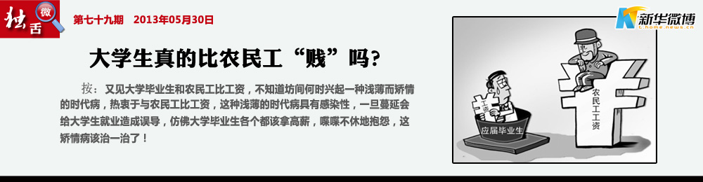 【新名詞:大學(xué)生農(nóng)民工】 他們出身農(nóng)村、考上大學(xué)進(jìn)入城市,畢業(yè)后與進(jìn)城打工的父兄匯流,又重新站在了同一條起跑線上;他們與新生代農(nóng)民工職業(yè)混同,工資相差無(wú)幾,生活境遇同樣是在城鄉(xiāng)之間漂浮。對(duì)這樣一個(gè)近幾年涌現(xiàn)的年輕人群體,我們稱之為“大學(xué)生農(nóng)民工”。