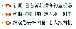 看看某浪網新聞的幾個標題。第一行,很氣憤;第2行左邊,心里舒服點;看到右邊,心里不禁激動了起來,速速點了進去,卻發(fā)現(xiàn)原來是標題黨!能不能說清楚???明明是實拍蛙人水下射擊訓練,你省去了幾個關鍵字,和前面的標題連到一起,我還以為和日本打起來了呢,嚴重傷害網友感情!