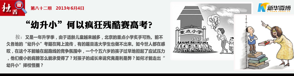 【孩子精神分裂】 A校搞面談,B校考奧數(shù),C??粗夭潘?,D校要英語(yǔ)會(huì)話,孩子們考前往往要精神分裂好長(zhǎng)一段時(shí)間,學(xué)生進(jìn)一次校門(mén)就得背一次考試圣經(jīng)。